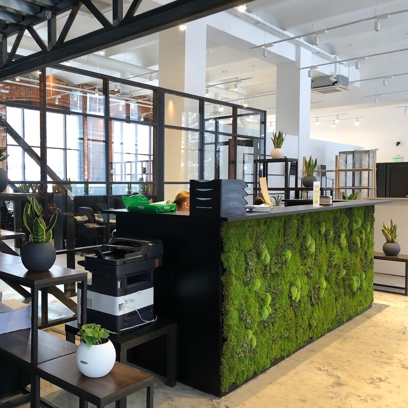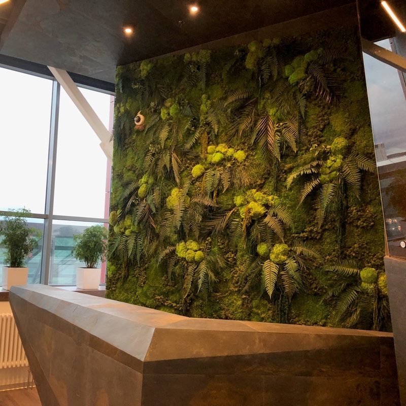 Не смотря на все преимущества, декорирование офисных помещений стабилизированным мхом и растениями относится к довольно доступному варианту вертикального озеленения. Такой вариант озеленения идеально подходит для любого помещения и интерьера. Особенно он подходит для помещений, в котором не могут выжить тропические растения - входные зоны, помещения, где присутствуют сильные сквозняки и колебания температур, места с недостаточным освещением. Композиции из стабилизированных растений или мха нуждаются в редком обслуживании, обычно, достаточно одного раза в месяц.